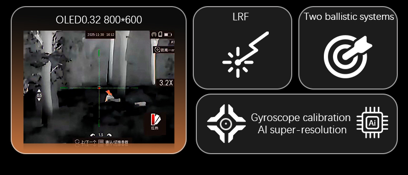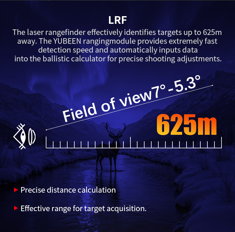 The laser rangefinder effectively identifies targets up to 625m away. The YUBEEN ranging module provides extremely fast detection speed and automatically inputs data into the ballistic calculator for precise shooting adjustments.