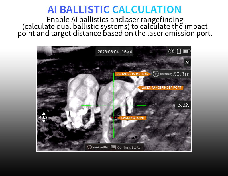 Enable AI ballistics and laser rangefinding (calculate dual ballistic systems) to calculate the impact point and target distance based on the laser emission port.